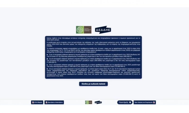 Άνοιξε τη Δευτέρα 12/5 η πλατφόρμα υποβολής αιτήσεων από τις επιχειρήσεις για τη χορήγηση επιδότησης που αφορά στις καταναλώσεις ηλεκτρικής ενέργειας για τους μήνες Δεκέμβριο 2024 και Ιανουάριο και Φεβρουάριο 2025.