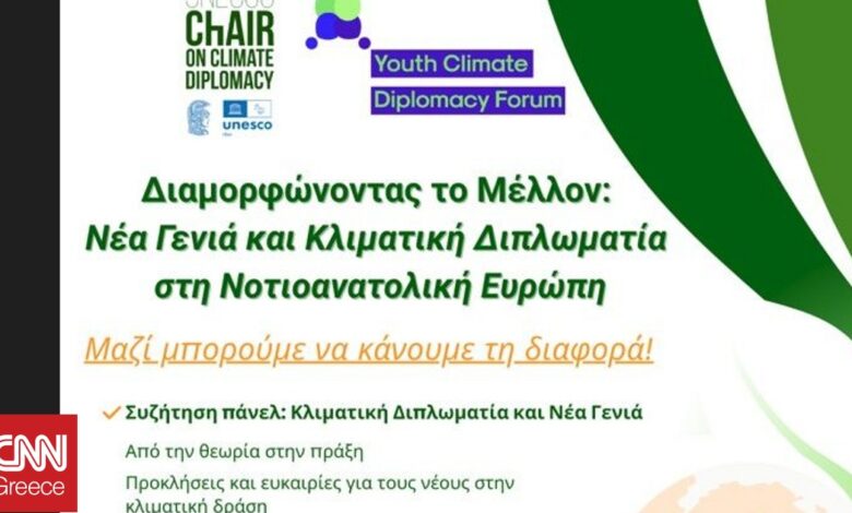Το Youth Climate Diplomacy Forum (YCDF), υπό την αιγίδα της Έδρας UNESCO για την Κλιματική Διπλωματία και με την υποστήριξη του Konrad Adenauer Stiftung, διοργανώνει μια ανοιχτή εκδήλωση με τίτλο: «Η νέα γενιά στο επίκεντρο της Κλιματικής Διπλωματίας στη Νοτιοανατολική Ευρώπη».