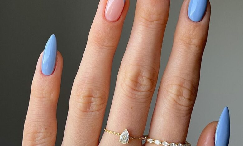 Κι αν πάλι έχεις glam διάθεση απλώνεις σε όλη την επιφάνεια την baby blue απόχρωση και στολίζεις τα νύχια με μικροσκοπικά κρύσταλλα.