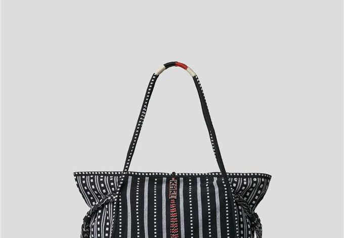 Η oversized τσάντα είναι κατασκευασμένη στο Μπουρκίνα Φάσο από 100% οργανικό βαμβάκι και είναι βαμμένη με βαφές πιστοποιημένες από τον κανονισμό GOTS. Τα υφάσματα “Faso Danfani” είναι υφαντά στο χέρι από γυναίκες τεχνίτες της CABES GIE, μιας κοινωνικής επιχείρησης και συνεργάτη τoυ EFI. Η σιλουέτα της τσάντας διακοσμείται με περίτεχνα κεντήματα από γυάλινες χάντρες φτιαγμένες από φυλές Μασάι στην Κένυα και συναρμολογημένες στο Tujikuze στο Ναϊρόμπι.