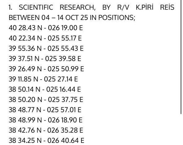 Η νέα Navtex που εξέδωσε η υδρογραφική υπηρεσία Σμύρνης του τουρκικού Πολεμικού Ναυτικού, αναφέρει ότι το Piri Reis, θα βγεί από τις 4 έως τις 14 Οκτωβρίου για έρευνες στο Αιγαίο με κατεύθυνση δυτικά της Χίου και της Μυτιλήνης.