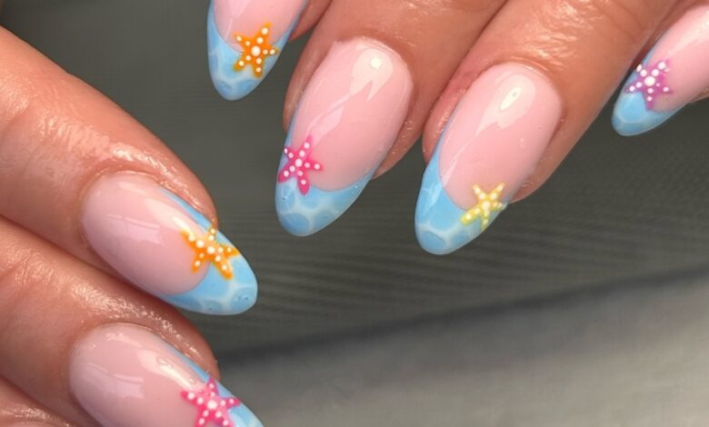 Ροζ βάση, μπλε tips, κοραλλί αποχρώσεις, αστερίες και σταγόνες νερού δημιουργούν το πιο εντυπωσιακό beach manicure.