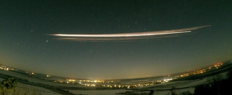 H φωτογραφία από το Κολμ της Γερμανίας, που δείχνει το ανώτερο στάδιο του πυραύλου Falcon 9 κατά την επανείσοδό του στην ατμόσφαιρα στις 19 Φεβρουαρίου 2025 – Credit: Gerd Baumgarten