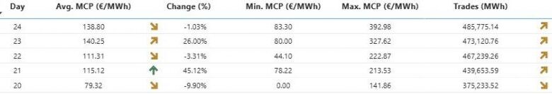 Συγκεκριμένα, στις 20 Ιουλίου η τιμή διαμορφώθηκε στα 79,32€/MWh, ενώ η τιμή για τις 24 Ιουλίου έφτασε τα 138,25€/MWh, με μέγιστη τιμή ημέρας στα 392,98€/MWh.