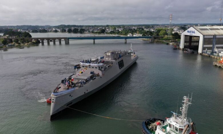 Η τρίτη κατά σειρά φρεγάτα του Πολεμικού Ναυτικού FDI Belharra βρίσκεται στο νερό, στον ποταμό Μπλαβέ, στο Λοριάν της Γαλλίας.