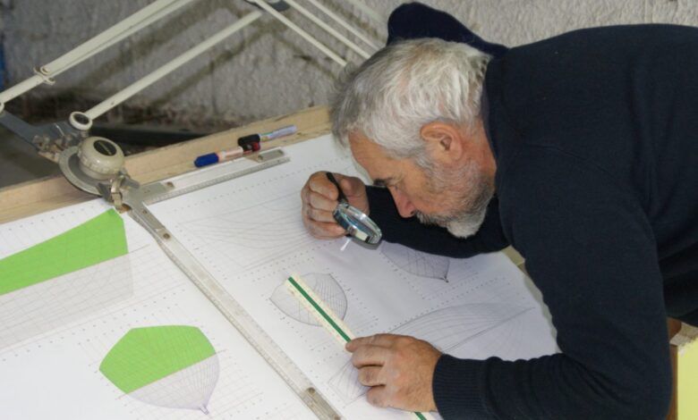 Η αρχή της ναυπήγησης ξεκινά από τη μεταφορά των διαστάσεων από το σχέδιο των ναυπηγικών γραμμών στο «πινακάκι» για τον σχεδιασμό σε φυσικό μέγεθος στη «σάλα». Ο Ν. Βλαβιανός επί το έργον.