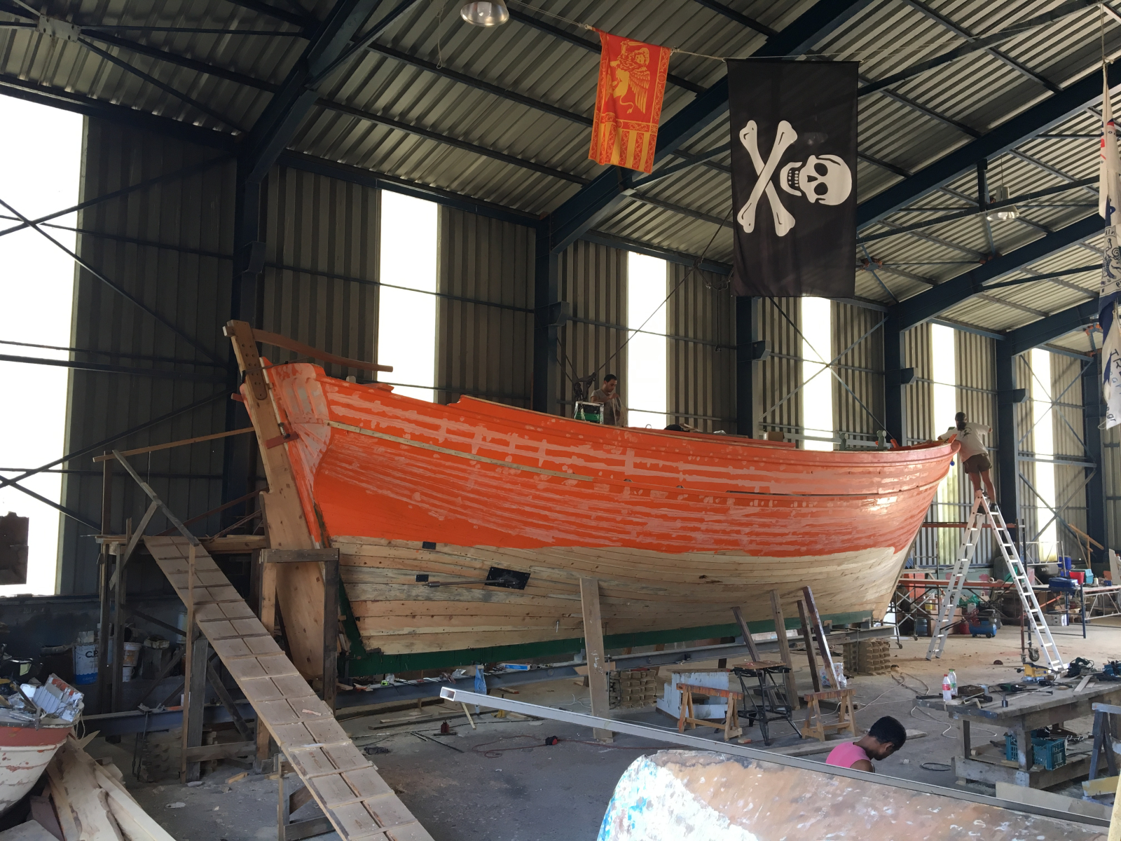 Στο εργαστήριο-ναυπηγείο όπου έγιναν οι εργασίες του σκαρώματος (ναυπήγηση) της γάστρας. Σε αυτή τη φάση έχει ολοκληρωθεί το πέτσωμα και το καλαφάτισμα