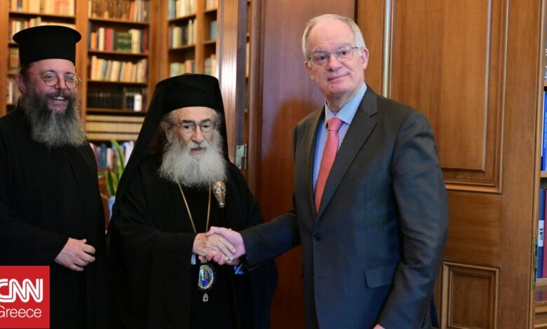Ο Πρόεδρος της Δημοκρατίας Κωνσταντίνος Τασούλας συναντήθηκε με τον Αρχιεπίσκοπο Σινά Δαμιανό στο Προεδρικό Μέγαρο.