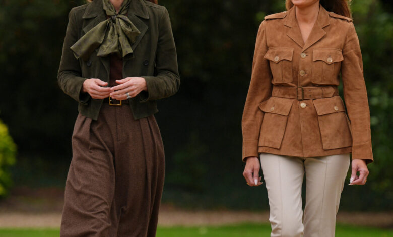 Η Δούκισσα του Κέιμπριτζ επέλεξε γήινες αποχρώσεις με boxy suede jacket, tweed midi φούστα και bow tie πουκάμισο, ολοκληρώνοντας το look με suede μπότες — η επιτομή του elegant fall style. Δίπλα της, η Melania Trump σε πιο urban mood με safari jacket, cropped παντελόνι και croco ballerinas, αποδεικνύοντας ότι το casual μπορεί να είναι απόλυτα chic.