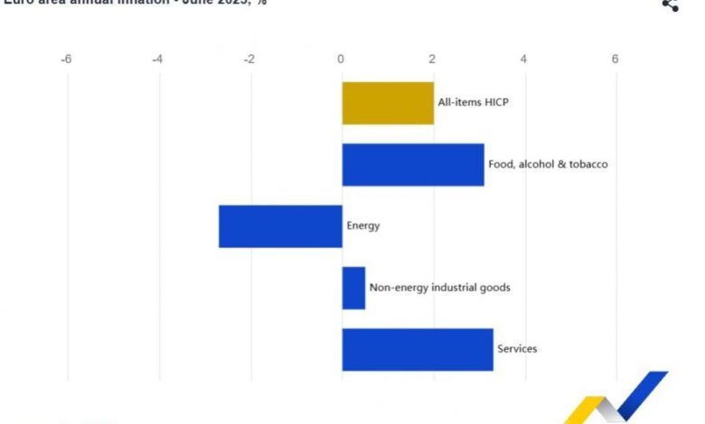 Στο 2,0% τον Ιούνιο του 2025 αναμένεται να διαμορφωθεί ο ετήσιος πληθωρισμός της ζώνης του ευρώ, από 1,9% τον Μάιο, σύμφωνα με την προκαταρκτική εκτίμηση της Eurostat, της στατιστικής υπηρεσίας της Ευρωπαϊκής Ένωσης. Ο αντίστοιχος αριθμός ανήλθε στο 3,6% για την Ελλάδα.