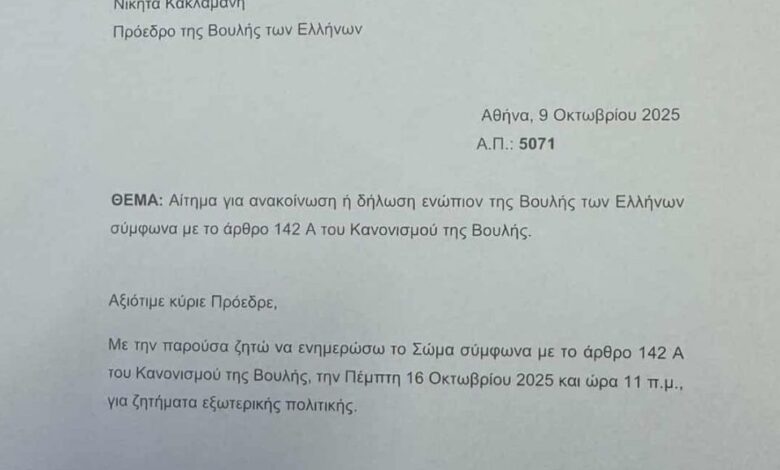 Ειδικότερα, ο Κυριάκος Μητσοτάκης υπέβαλε αίτημα για να ενημερώσει το ελληνικό κοινοβούλιο στις 11:00, σύμφωνα με το άρθρο 142 Α του Κανονισμού της Βουλής.