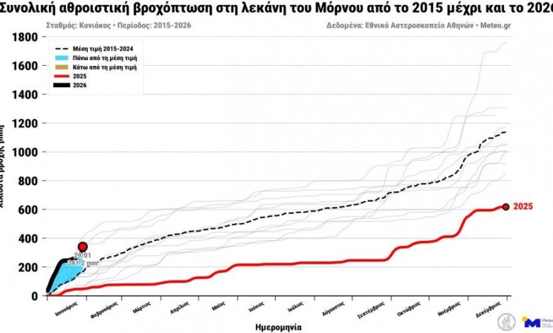 Ο σταθμός «Κονιάκος» από την αρχή του έτους έχει καταγράψει 341 χιλιοστά βροχής και χιονιού, ενώ ο σταθμός στο φράγμα του Μόρνου 227 χιλιοστά.