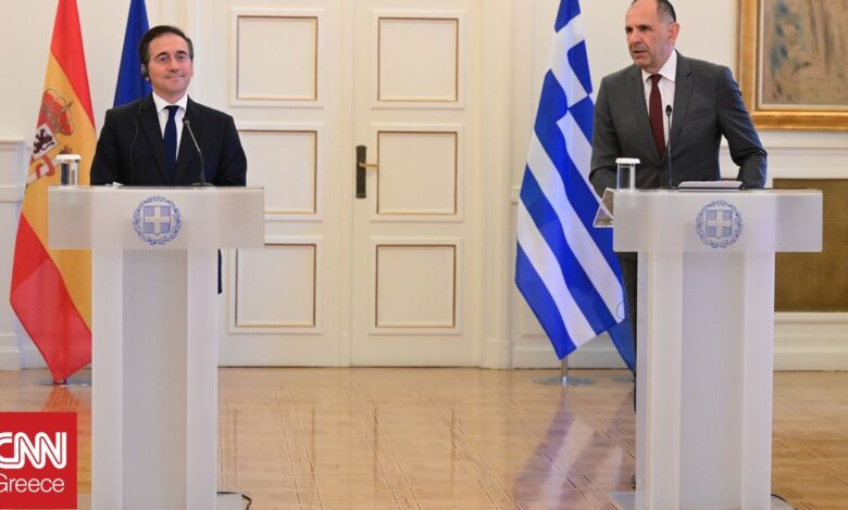 Συνάντηση με τον υπουργό Εξωτερικών της Ισπανίας José Manuel Albares Bueno είχε σήμερα ο Έλληνας ΥΠΕΞ Γιώργος Γεραπετρίτης, με τους δύο άνδρες να συζητούν τις εξελίξεις στη Γάζα και στην Ουκρανία, το ζήτημα της κλιματικής αλλαγής αλλά και την παράτυπη μετανάστευση.