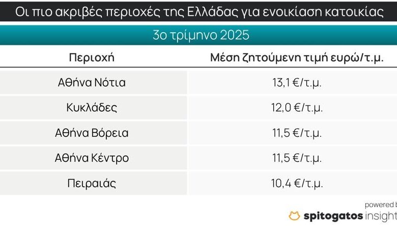 Ακολουθούν οι Κυκλάδες που έχασαν την πρώτη θέση που κατείχαν κατά το 2ο τρίμηνο του 2025, τα Βόρεια Προάστια της Αθήνας, το κέντρο της Αθήνας και ο Πειραιάς με ΜΖΤ ενοικίασης κατοικίας στα 10,4 ευρώ/τ.μ.