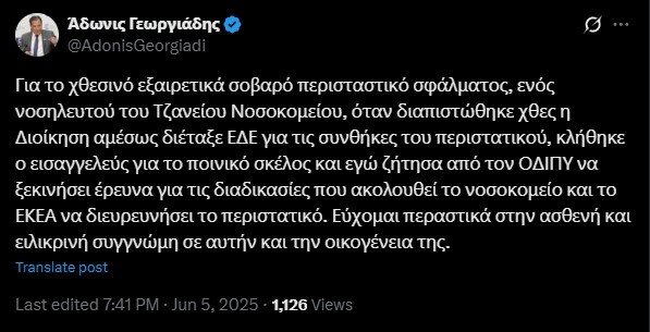 «Για το χθεσινό εξαιρετικά σοβαρό περιστατικό σφάλματος, ενός νοσηλευτού του Τζανείου Νοσοκομείου, όταν διαπιστώθηκε χθες η Διοίκηση αμέσως διέταξε ΕΔΕ για τις συνθήκες του περιστατικού, κλήθηκε ο εισαγγελεύς για το ποινικό σκέλος και εγώ ζήτησα από τον ΟΔΙΠΥ να ξεκινήσει έρευνα για τις διαδικασίες που ακολουθεί το νοσοκομείο και το ΕΚΕΑ να διερευνήσει το περιστατικό. Εύχομαι περαστικά στην ασθενή και ειλικρινή συγγνώμη σε αυτήν και την οικογένεια της».