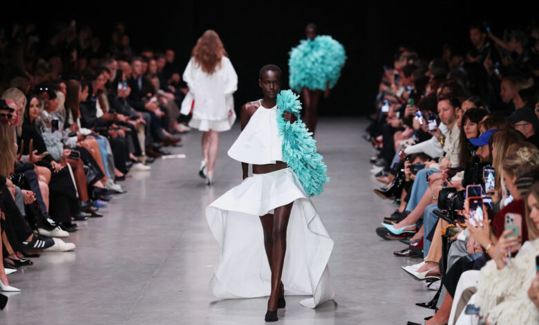Ακολούθησε ένα παιχνίδι αντιθέσεων: φουσκωτά φορέματα, μακριά κρόσσια, ελαστικά τελειώματα, αλλά και looks με ανακυκλωμένο τζιν και αξεσουάρ που έφεραν νέες προτάσεις για το τι σημαίνει «πολυτέλεια με συνείδηση».