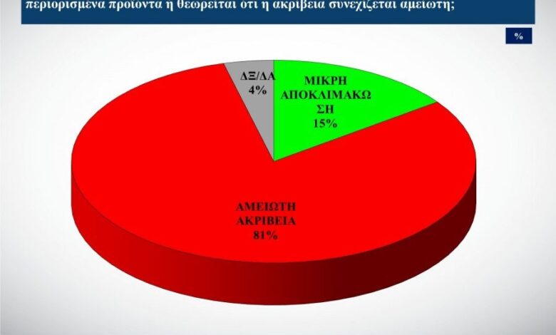 Αμείωτη θεωρούν πως είναι η ακρίβεια το 81% των πολιτών και μικρή αποκλιμάκωση «βλέπει» μόλις το 15% απαντώντας στο ερώτημα της δημοσκόπησης:«Έχετε παρατηρήσει έστω και μικρή αποκλιμάκωση στις τιμές, έστω και σε περιορισμένα προϊόντα ή θεωρείτε ότι η ακρίβεια συνεχίζεται αμείωτη;».