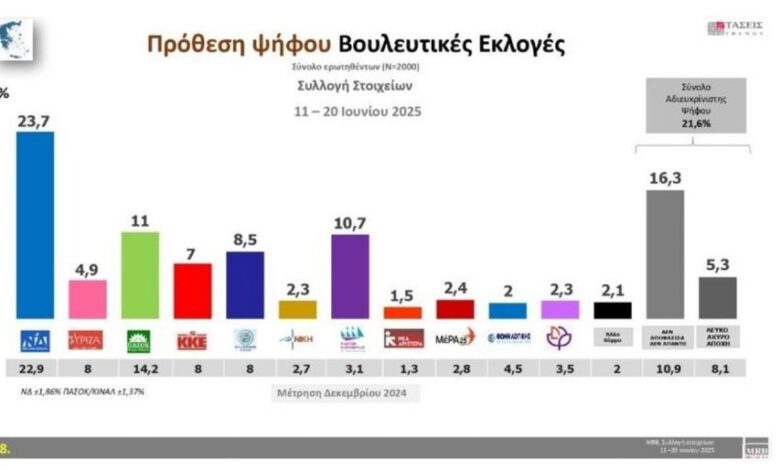 Στην πρόθεση ψήφου, η ΝΔ συγκεντρώνει 23,7%, αυξάνοντας το ποσοστό της κατά μία μονάδα σε σύγκριση με τα τέλη Μαΐου (22,7%). Το ΠΑΣΟΚ ενισχύεται και αυτό, φθάνοντας το 11%, ενώ η Πλεύση Ελευθερίας υποχωρεί στο 10,7%.