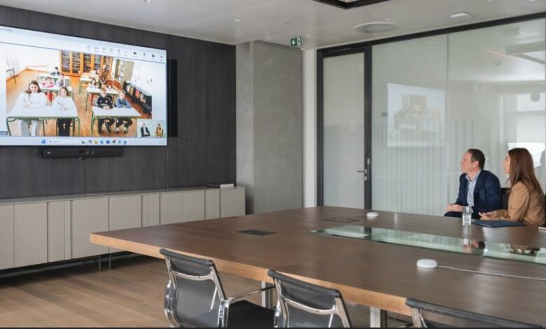 H Υπουργός Παιδείας, Σοφία Ζαχαράκη μαζί με τον Πρόεδρο και Διευθύνοντα Σύμβουλο του Ομίλου ΟΤΕ, Κώστα Νεμπή κατά τη συνάντησή τους για να συνομιλήσουν διαδικτυακά με μαθητές του Δημοτικού Σχολείου στο Σκεπαστό Καλαβρύτων