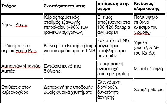 Η ηγεσία του Ιράν φαίνεται ότι επιθυμεί να κρατήσει τον ενεργειακό του τομέα έξω από τη σύγκρουση, καθώς τα έσοδα από το πετρέλαιο και το φυσικό αέριο παραμένουν μια οικονομική σανίδα σωτηρίας, αποφέροντας περισσότερα από 36 δισεκατομμύρια δολάρια ετησίως. Πάνω από το 75% της ηλεκτρικής ενέργειας του Ιράν εξαρτάται από το φυσικό αέριο και το καθεστώς αντιμετωπίζει ήδη ελλείψεις καυσίμων στο εσωτερικό του και αστάθεια στην ηλεκτροδότηση. Η κλιμάκωση αυτής της ευπάθειας θα μπορούσε να αποδειχθεί καθοριστική.