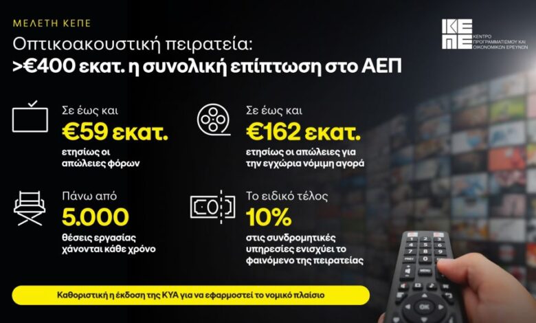 Την ανάγκη για μία πολυεπίπεδη στρατηγική με στόχο την καταπολέμηση του φαινομένου της οπτικοακουστικής πειρατείας και τον περιορισμό των αρνητικών επιπτώσεων σε έσοδα αλλά και θέσεις εργασίας φέρνει στο προσκήνιο μελέτη του Κέντρου Προγραμματισμού και Οικονομικών Ερευνών (ΚΕΠΕ) για λογαριασμό της Εταιρίας Προστασίας Οπτικοακουστικών Έργων (ΕΠΟΕ). Η μελέτη επισημαίνει ότι ο αριθμός των παράνομων συνδέσεων εκτιμάται σε περίπου 800.000!