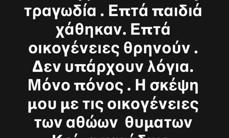 «Ένα ταξίδι χαράς και αγάπης για την ομάδα κατέληξε σε ανείπωτη τραγωδία. Επτά παιδιά χάθηκαν. Επτά οικογένειες θρηνούν. Δεν υπάρχουν λόγια. Μόνο πόνος. Η σκέψη μου με τις οικογένειες των αθώων θυμάτων. Κρίμα κι άδικο».