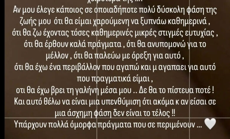 «Αν μου έλεγε κάποιος χρόνια πριν, όταν είχα κατάθλιψη και δεν πίστευα ότι θα νιώσω ποτέ ξανά θετικό συναίσθημα … Αν μου έλεγε πέρυσι, που η υγεία μου ήταν στα χειρότερά της … Αν μου έλεγε κάποιος σε οποιαδήποτε πολύ δύσκολη φάση της ζωής μου ότι θα είμαι χαρούμενη να ξυπνάω καθημερινά, ότι θα ζω έχοντας τόσες μικρές στιγμές ευτυχίας, ότι θα ανυπομονώ για το μέλλον, δεν θα το πίστευα ποτέ!»