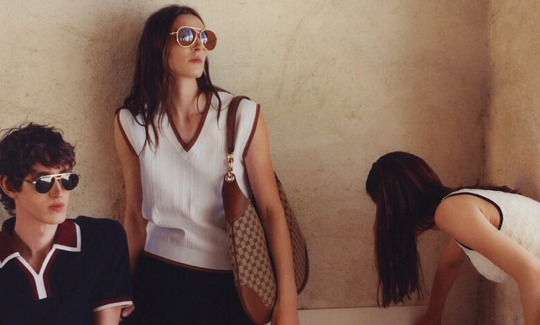 Τα γυναικεία looks περιλαμβάνουν πλισέ φούστες, αμάνικα top και κομψές λεπτομέρειες από την εμβληματική λωρίδα Web του οίκου. Στα ανδρικά, ξεχωρίζουν τα ρετρό polo με έντονους γιακάδες και φίνα υφάσματα που αγκαλιάζουν διακριτικά τη σιλουέτα. Τα αξεσουάρ είναι εκείνα που ολοκληρώνουν την αφήγηση: aviator γυαλιά, καμβά τσάντες, κορδέλες και κάλτσες που αποπνέουν ένα “old money” σπορ ύφος, χωρίς να χάνουν την πολυτέλεια που χαρακτηρίζει τον ιταλικό οίκο.