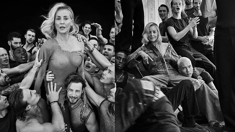 Σε άλλο στιγμιότυπο της ίδιας φωτογράφησης, η Σάρον Στόουν εμφανίζεται να κάθεται ανάμεσα σε δεκάδες άνδρες, σε μια πόζα που θυμίζει την εμβληματική σκηνή με το σταυροπόδι από το «Βασικό Ένστικτο».