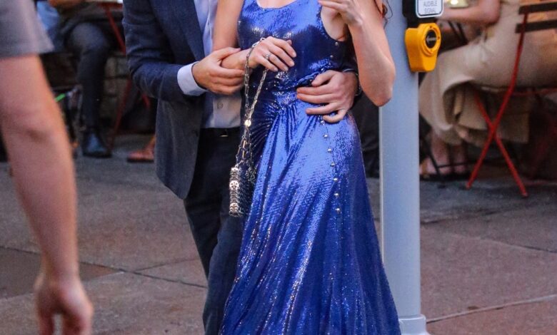 Για τις ανάγκες της σκηνής, η σταρ επέλεξε ένα midi φόρεμα σε μπλε απόχρωση, διακοσμημένο με sequins και με ντραπέ σχέδιο στη μέση – ένα έξυπνο στιλιστικό κόλπο που αναδεικνύει τη σιλουέτα χωρίς να την επιβαρύνει. Το look ολοκληρώθηκε με ασορτί μεταλλικά πέδιλα, τα οποία έδωσαν έξτρα λάμψη και μια διακριτική πολυτέλεια στο outfit.