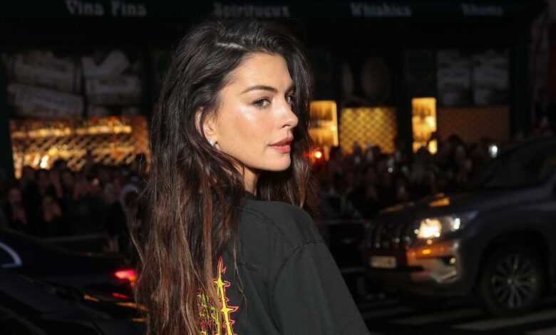 Καθισμένη στην πρώτη σειρά, η Hathaway, έκλεψε τις εντυπώσεις με ένα graphic t-shirt Balenciaga, δερμάτινα opera gloves και oversized μαύρα γυαλιά ηλίου. Ωστόσο, η πραγματική στιγμή-έκπληξη ήρθε όταν σηκώθηκε.