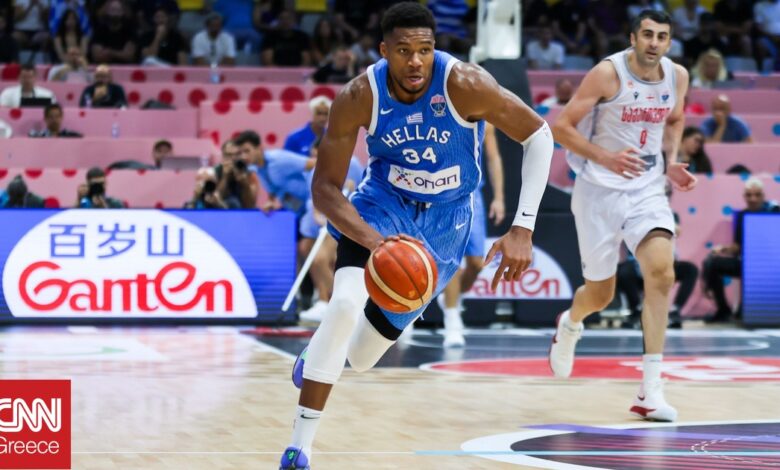 Ο Γιάννης Αντετοκούνμπο φαίνεται στο βίντεο να παίρνει την πάσα να κοιτά ότι βρίσκεται έξω από τη γραμμή του τρίποντου και να σκοράρει, κατά τη διάρκεια της μεγάλης νίκης της χώρας μας απέναντι στη Γεωργία με 94-53, στο πλαίσιο της 3ης αγωνιστικής του 3ου ομίλου του EuroBasket 2025.