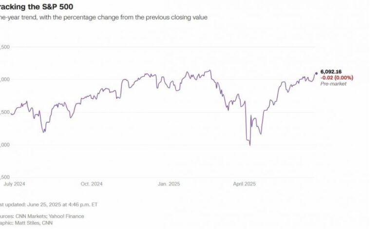 Ο δείκτης είχε εκτιναχθεί κατά 2,1% τις δύο τελευταίες ημέρες, καθώς οι επενδυτές χαιρέτισαν την κατάπαυση του πυρός, αν και εύθραυστη, μεταξύ του Ισραήλ και του Ιράν. Καθώς η χρηματιστηριακή αγορά έχει επιστρέψει προς τα υψηλά επίπεδα ρεκόρ, οι επενδυτές αναρωτιούνται αν υπάρχει περιθώριο για τις μετοχές να ανέβουν υψηλότερα ή αν υπάρχουν περαιτέρω εμπόδια μπροστά τους.