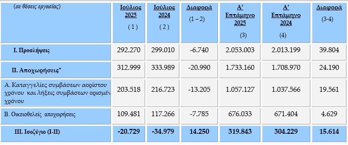 Συγκεκριμένα, σύμφωνα με τα στοιχεία των ροών μισθωτής απασχόλησης του Ιουλίου 2025, οι αναγγελίες πρόσληψης ανήλθαν σε 292.270, ενώ οι αποχωρήσεις σε 312.999. Από τις 312.999 συνολικά αποχωρήσεις, οι 109.481 προήλθαν από οικειοθελείς αποχωρήσεις και οι 203.518 από καταγγελίες συμβάσεων αορίστου χρόνου ή λήξεις συμβάσεων ορισμένου χρόνου.