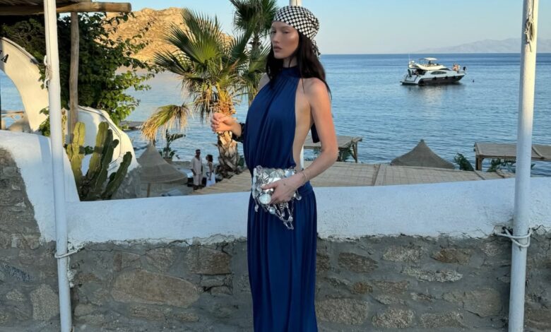 Κι αν πρέπει να επιλέξω μία μόνο beauty λεπτομέρεια αυτή είναι το μαντήλι στα μαλλιά της που εκτός από stylish είναι και πρακτικό ειδικά στα ελληνικά νησιά όπου οι αέρηδες είναι συχνοί. Το super model φοράει ένα αποκαλυπτικό navy blue maxu φόρεμα και κρατάει μια metallic τσάντα με summer charms όπως κοχύλια.