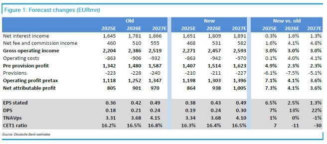 Οι βασικές αλλαγές στο μοντέλο της Deutsche Bank περιλαμβάνουν μια αξιοσημείωτη αναβάθμιση στα καθαρά έσοδα από τόκους, σημαντική ανοδική αναθεώρηση στα έσοδα από προμήθειες, αλλά και μια αύξηση στα λειτουργικά έξοδα, τα οποία όμως αντισταθμίζονται από μειωμένες προβλέψεις για επισφάλειες.
