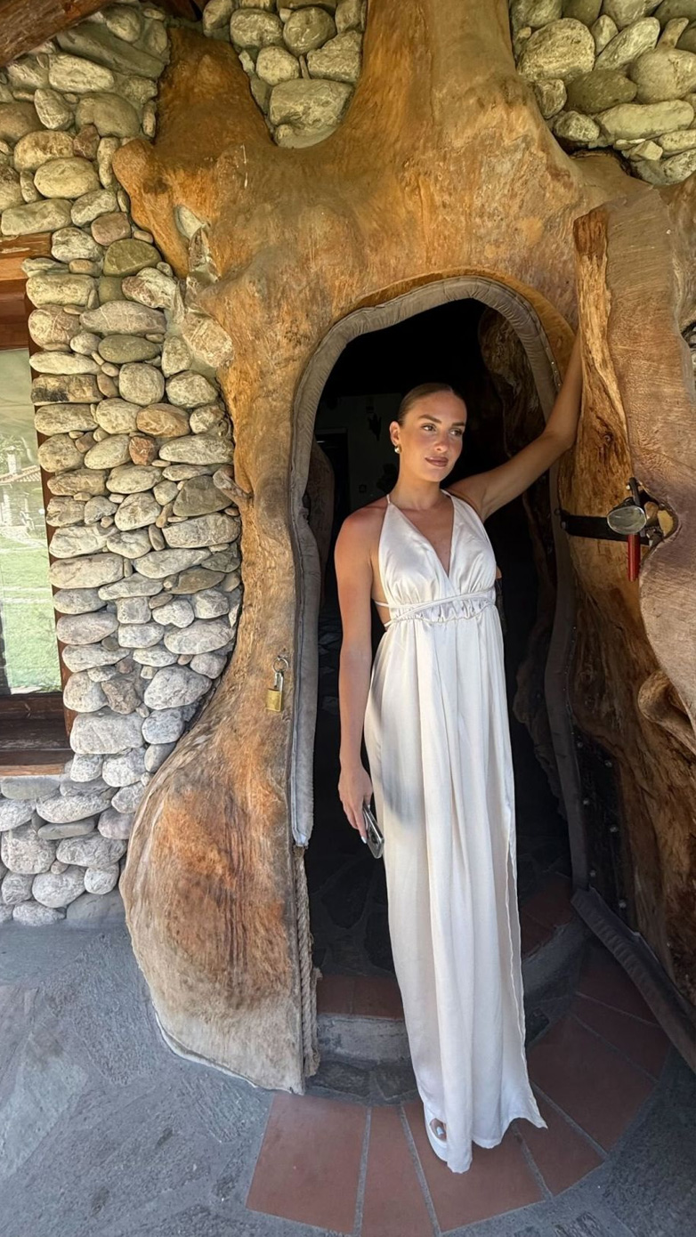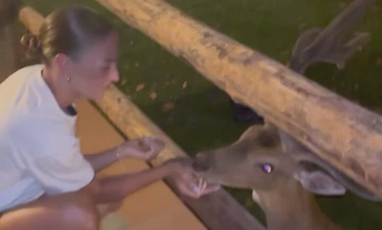 Στο Κεραμαριό η Δαλάκα ξετρελάθηκε! Φωτογραφήθηκε με τα ελαφάκια που κυκλοφορούν ανενόχλητα και τα τάιζε ψωμί με χαρά, έκανε βουτιές στην πισίνα, φωτογράφησε το ξεχωριστό πρωινό που φτάνει έξω από την πόρτα παραδoσιακα σε καλάθι, ενώ πόζαρε και στην είσοδο της κατοικίας που είναι ένα δέντρο, αφού η ανάδειξη του δέντρου είναι η βάση της αρχιτεκτονικής ιδέας, γ’ αυτό και στο εσωτερικό έχει κορμούς δέντρου και ξύλινα έπιπλα.