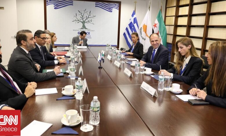 Η πρώτη τριμερής συνάντηση μεταξύ του Έλληνα Υπουργού Εξωτερικών Γιώργου Γεραπετρίτη, του Κύπριου Υπουργού Εξωτερικών, Κωνταντίνου Κόμπου και του προσωρινού Υπουργού Εξωτερικών, Ασαάντ Αλ-Σαϊμπάνι, πραγματοποιήθηκε το βράδυ της Παρασκευής (26/9) στη Νέα Υόρκη.