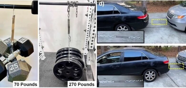 Δύο χαλύβδινες πλάκες κολλημένες με υλικό από μαγειρικό λάδι μπορούσαν να σηκώσουν βάρος αρκετών δεκάδων κιλών (αριστερά), ακόμη και να ρυμουλκήσουν αυτοκίνητο (δεξιά)