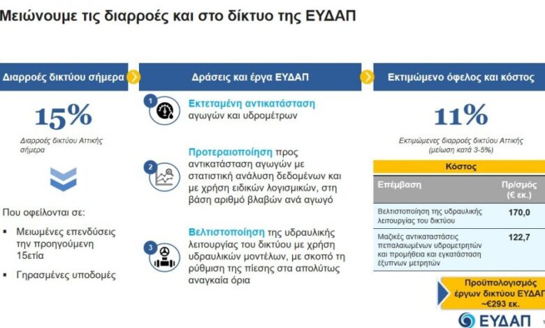 Οι συγκεκριμένες δράσεις, ο προϋπολογισμός των οποίων ανέρχεται στα 293 εκατομμύρια ευρώ, αναμένεται να φέρουν μείωση των διαρροών από 15% στο 11% στο δίκτυο της Αττικής.