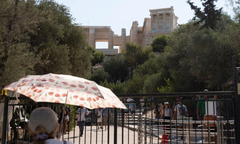 Κύμα καύσωνα σαρώνει τη χώρα, με επισκέπτες και πολίτες να αντιμετωπίζουν με καπέλα, άφθονο νερό και ομπρέλες τον καυτό ήλιο και τη ζέστη