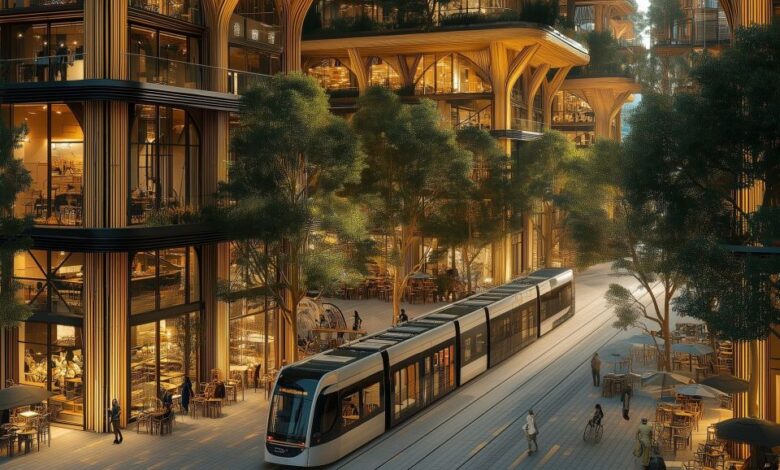 Καλλιτεχνική απεικόνιση κεντρικού δρόμου με ξύλινα κτήρια και τραμ