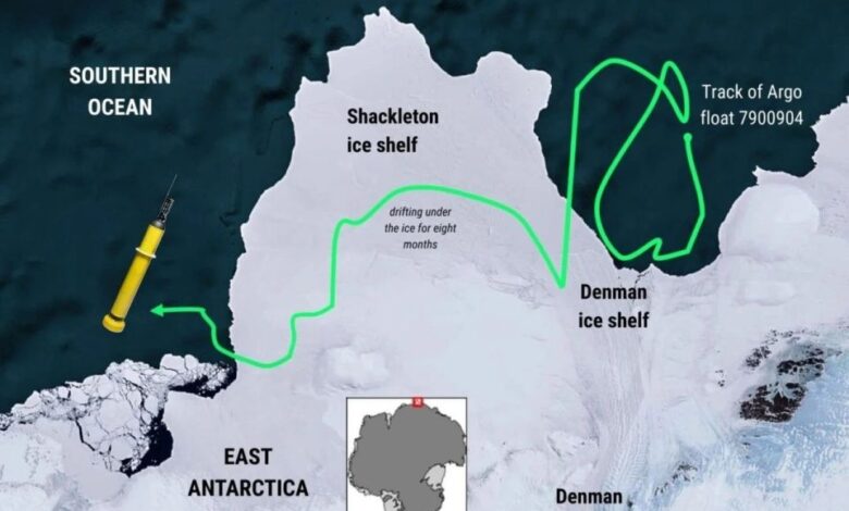 Η εκτιμώμενη διαδρομή του πλωτήρα Argo κάτω από τις παγοκρηπίδες Denman και Shackleton