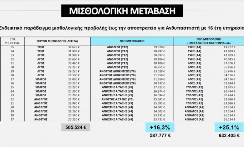 • Ένας Ανθυπολοχαγός, με 3 έτη υπηρεσίας, άγαμος, που υπηρετεί στην παραμεθόριο, πριν λάμβανε 1.197 ευρώ, ενώ με το νέο μισθολόγιο 1.576 ευρώ (Αύξηση 31,7%)