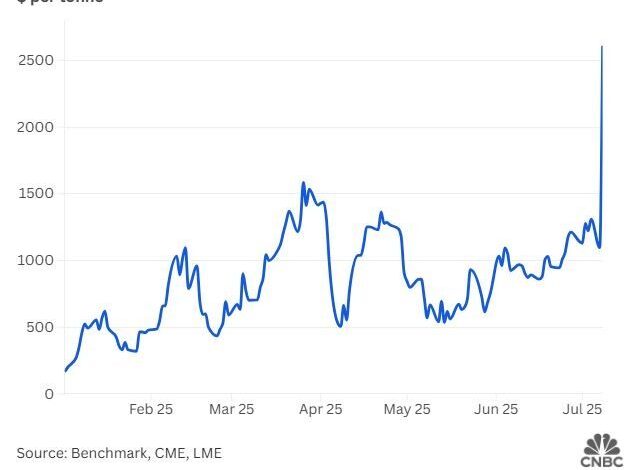 Η αιφνιδιαστική ανακοίνωση του Τραμπ την Τρίτη για την επιβολή δασμού 50%, στο υψηλότερο άκρο των προσδοκιών των εμπόρων, ταρακούνησε απότομα την αγορά χαλκού, με το ασφάλιστρο που πληρώνουν οι αγοραστές των ΗΠΑ έναντι του υπόλοιπου κόσμου να υπερδιπλασιάζεται σε επίπεδο ρεκόρ άνω των 2.600 δολαρίων.