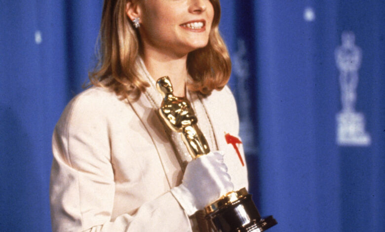 Η Jodie Foster στα Όσκαρ το 1992 με κουστούμι του σχεδιαστή και sequin top συνδυασμένα με satin opera γάντια.