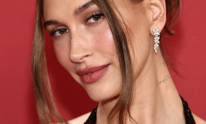 Hailey Bieber: Τα μαλλιά της είναι μαζεμένα σε ένα messy bun με τις iconic τούφες να ακουμπούν στο πρόσωπό της. Όσον αφορά στο μακιγιάζ έμεινε πιστή στο αγαπημένο της glazed με λάμψη στα ροζ ζυγωματικά της και γήινες αποχρώσεις στα μάτια.