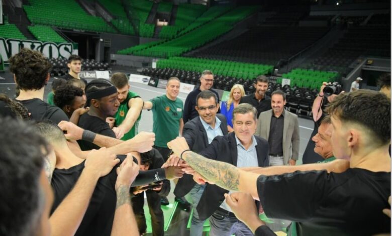 Ergin Ataman, προπονητής Παναθηναϊκού AKTOR, Γιάννης Πανόπουλος, OPAP Chief Online Officer, Οδυσσέας Χριστοφόρου, Αναπληρωτής Διευθύνων Σύμβουλος ΟΠΑΠ, Φώτης Ζησιμόπουλος, Chief Sales & Marketing OPAP Stores Officer, και Lukas Antos, OPAP Chief Customer Officer, με την ομάδα του Παναθηναϊκού AKTOR