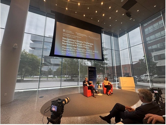 Στη συνομιλία του με την Κοσμήτορα του Columbia Climate School, Alexis Abramson, παρουσία των φοιτητών του Columbia, ο Αλέξανδρος Σαρρηγεωργίου μίλησε για το πώς η κλιματική αλλαγή αναδιαμορφώνει την ασφαλιστική αγορά παγκοσμίως, τον ρόλο της Τεχνητής Νοημοσύνης, καθώς και το ότι o ασφαλιστικός κλάδος είναι πολύ πιο δυναμικός από ό,τι ορισμένοι μπορεί να θεωρούν.