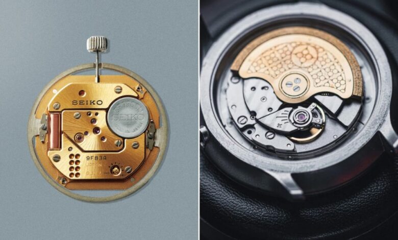 Αριστερά, βλέπουμε έναν μηχανισμό quartz σε Seiko ρολόι και δεξιά έναν μηχανικό μηχανισμό.